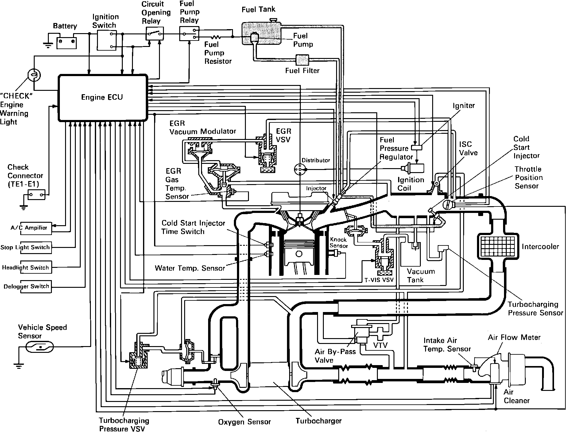The Toyota Computer Control System (TCCS) is the central control for electronic fuel injection (EFI), electronic spark advance (ESA), idle speed control (ISC), and the exhaust gas recirculation (EGR). The electronic control unit (ECU) monitors engine intake air volume, intake air temperature, coolant temperature, engine rpm and exhaust oxygen content, and regulates engine operation. The TCCS has a self-diagnostic function that helps find malfunctions or abnormalities in the system.