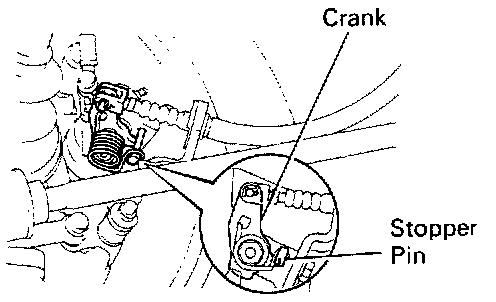 d. Loosen the adjusting nut and brake cable, and check that the parking brake crank touches stopper pin.