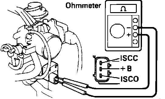 1. Disconnect the ISC valve connector.2. Using an Ohmmeter, measure the resistance between terminal +B and terminals ISCC and ISCO.