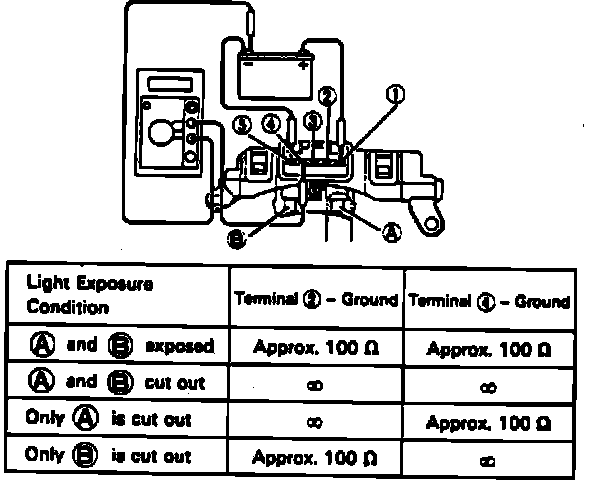3. Install thick card at parts A and B and measure resistance between ground and terminals 2 and 4 when light is cut out.