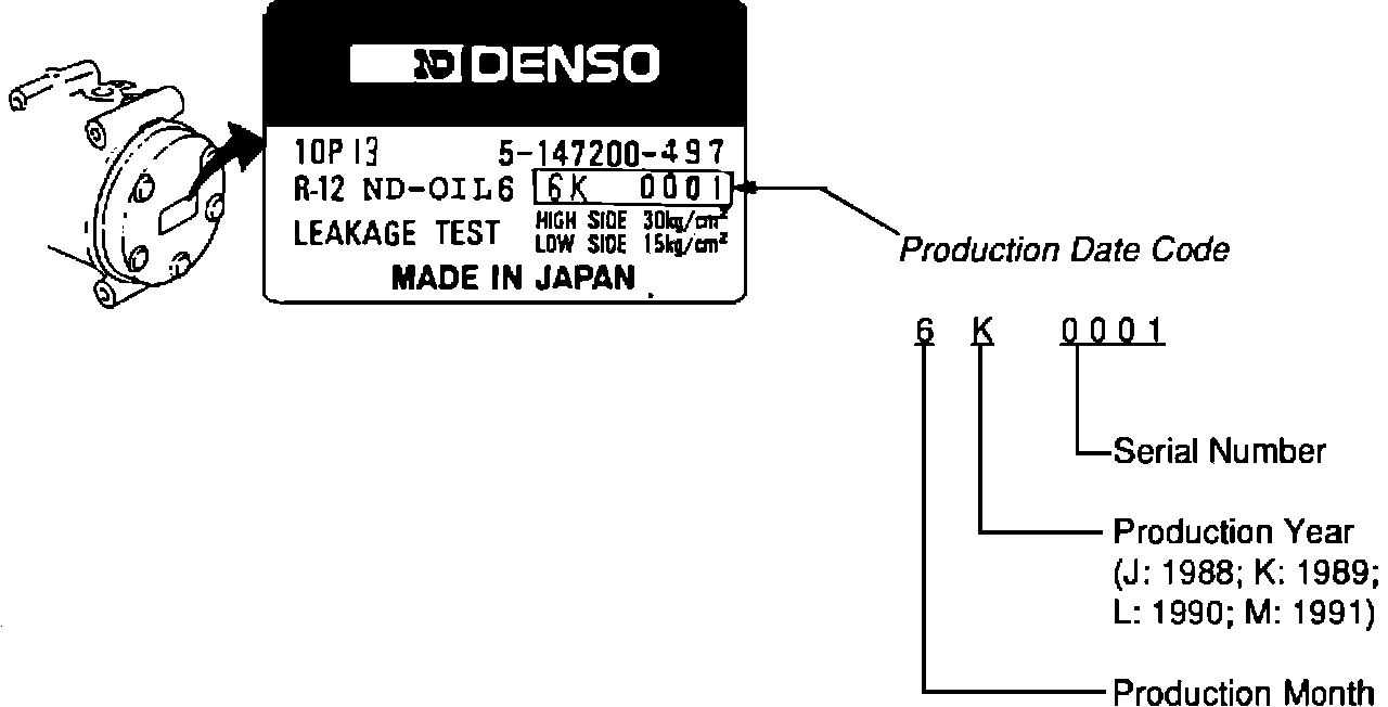 When replacing a shaft seal, use the production date code on the back of the compressor cylinder to identify the type of shaft seal on the compressor.