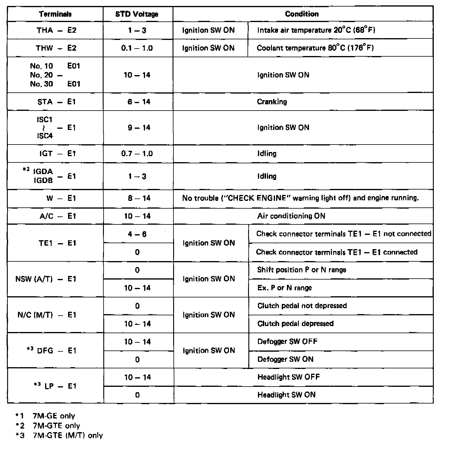 INSPECTION OF ECUHINT: The EFI circuit can be checked by measuring the voltage and resistance at the wiring connectors of the engine ECU.