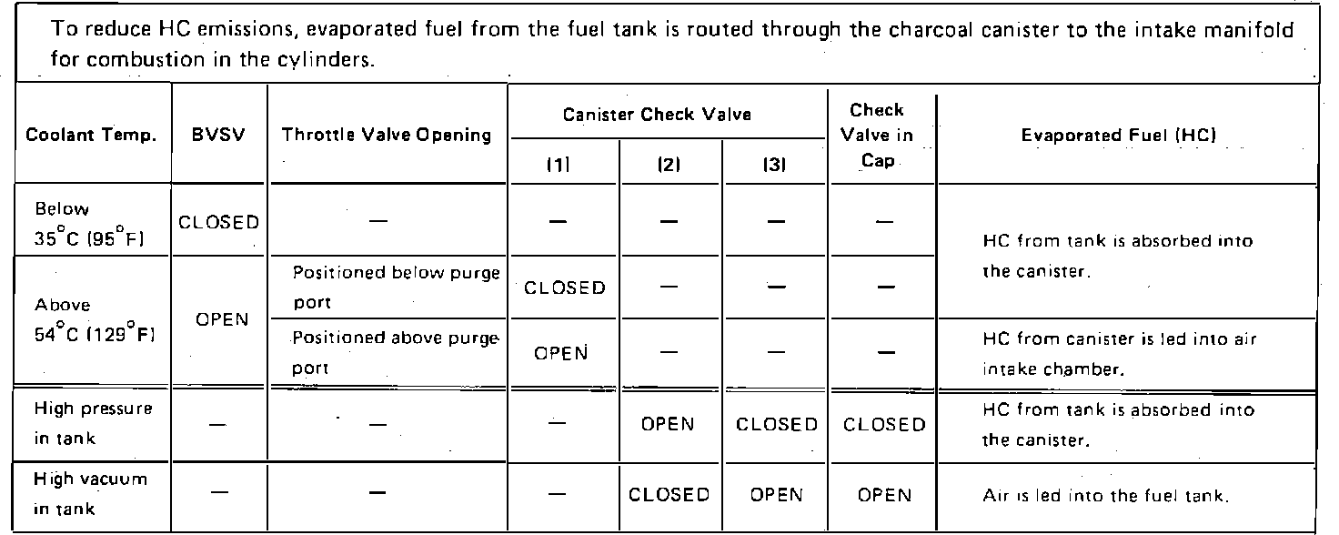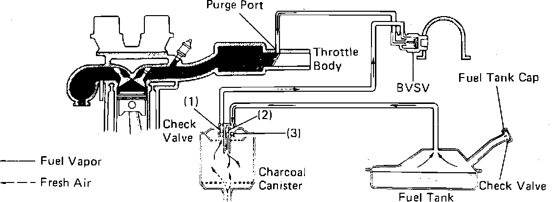 This system is designed to prevent raw fuel vapors from escaping into the atmosphere by the use of a charcoal canister, bi-metal vacuum switching valve (BVSV), purge port at the intake manifold and a vented fuel filler cap. The system holds fuel vapor collected from the fuel tank in the charcoal canister where it is stored until the engine warms to 129° F. The BVSV then opens and allows engine vacuum to draw fuel vapors into the combustion process through a check valve in the canister. When air is drawn through the canister, it opens another check valve in the canister that pulls fresh air through the system. This process in turn, pulls air into the fuel tank through the check valve in the fuel cap.