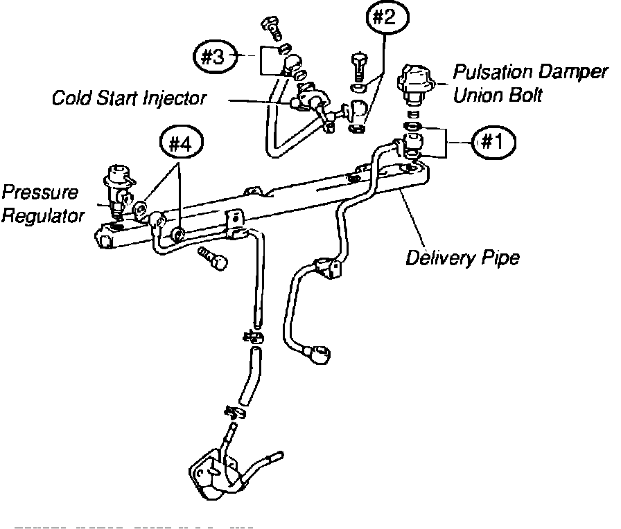The fuel line torque specifications on 7M-GE and 7M-GTE engines have been revised as the gasket material has changed from copper-plated to tin-plated. Torques for union bolts and pulsation damper are different depending on the type of gasket used.