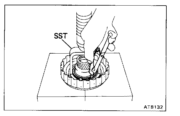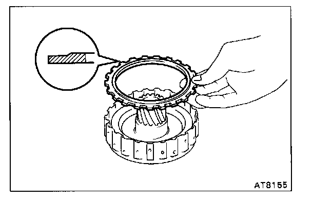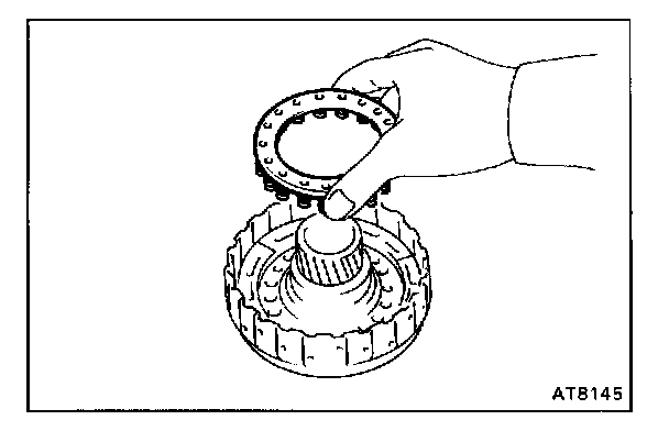 b. Being careful not to damage the O-rings, press in the direct clutch piston into the clutch drum with both hands.