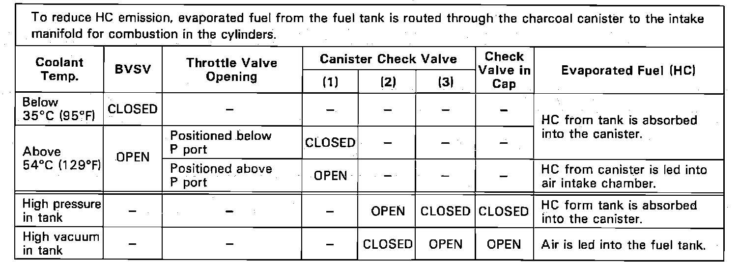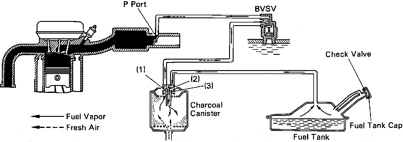 This system is designed to prevent raw fuel vapors from escaping into the atmosphere by the use of a charcoal canister, bi-metal vacuum switching valve (BVSV), purge port at the intake manifold and a vented fuel filler cap. The system holds fuel vapor collected from the fuel tank in the charcoal canister where it is stored until the engine warms to 129° F. The BVSV then opens and allows engine vacuum to draw fuel vapors into the combustion process through a check valve in the canister. When air is drawn through the canister, it opens another check valve in the canister that pulls fresh air through the system. This process in turn, pulls air into the fuel tank through the check valve in the fuel cap.