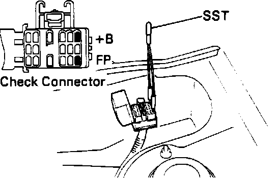 8. Using a service wire, short terminals +B and FP of the engine check connector. This will cause the fuel pump to operate and pressurize the system.