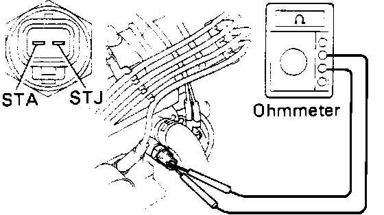 1. Unplug connector from Cold Start Injector Time Switch.2. Connect a voltmeter to terminal STA on the harness and ground, while an assistant turns the ignition switch to the start position (crank mode).