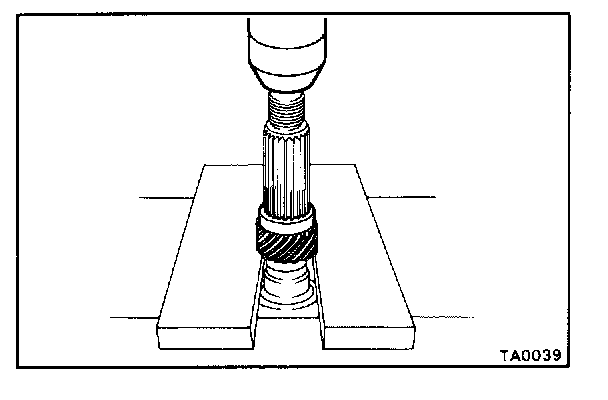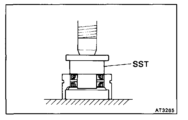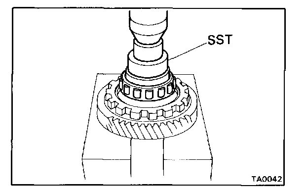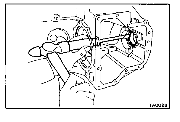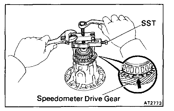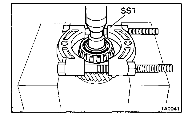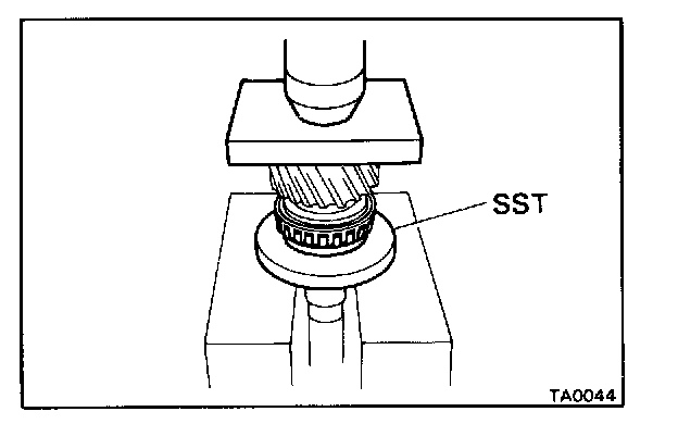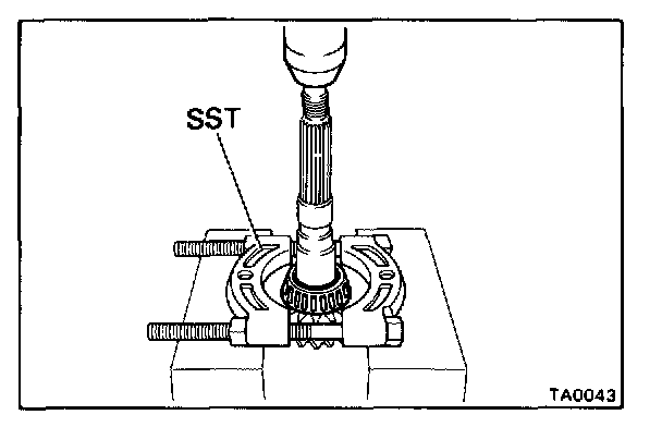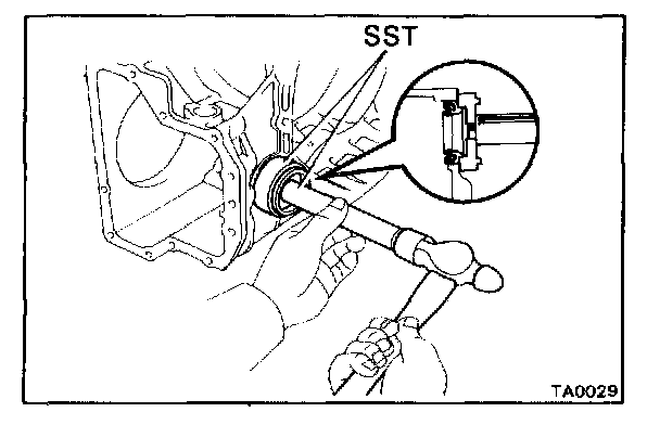 Fasten SST under the bearing above the cut-outs on the speedometer drive gear. Remove the bearing from the case.