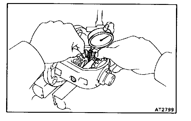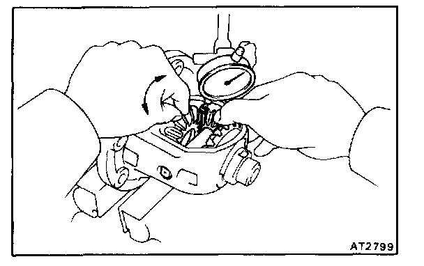 Using a dial gauge, measure the backlash of each side gear while holding one pinion toward the case.