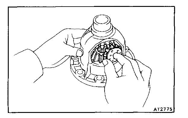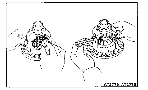b. Install the side gears with thrust washers, pinion thrust washers and pinion gears.