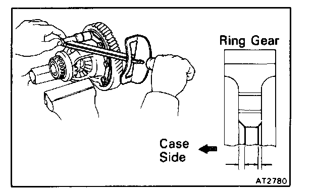 Measure the side gear backlash while holding one pinion gear toward the case.