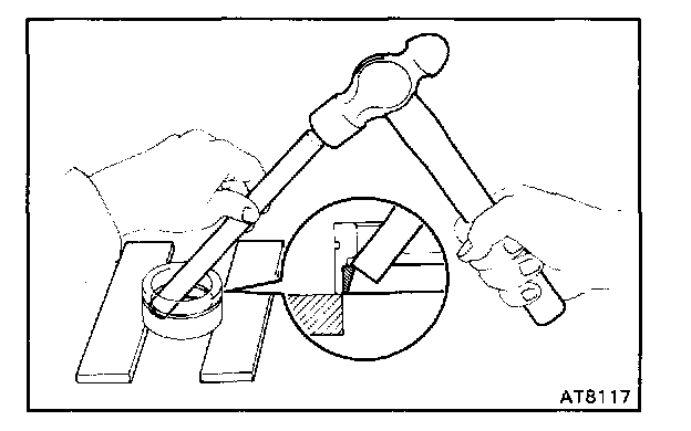 Using a hammer and brass bar, drive out the outer race from the cage.
