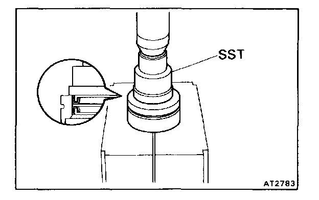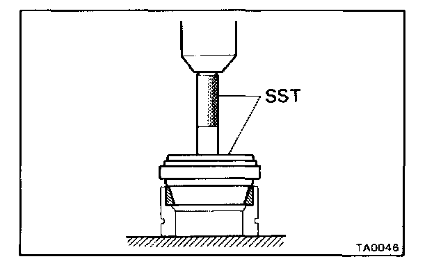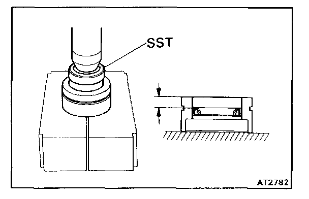 c. With the oil seal lip facing upward, use SST to press in a new oil seal until its end is flush with the surface of the cage.
