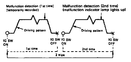 Diagnostic trouble codes 25, 26, 27 and 71 use "2 trip detection logic". With this logic, when a malfunction is first detected, the malfunction is temporarily stored in the ECM memory. If the same case is detected again during the second drive test, this second detection causes the malfunction indicator lamp to light up. The 2 trip repeats the same mode a 2nd time. (However, the ignition switch must be turned OFF between the 1st time and 2nd time.) In the Test Mode, the malfunction indicator lamp lights up the 1st time a malfunction is detected.