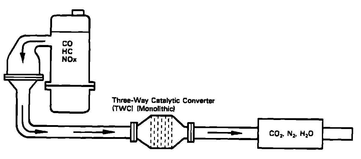 The three way catalyst (TWC) reduces oxides of nitrogen (NOx) as well as HC and CO, producing nitrogen, water, and carbon dioxide as by-products.