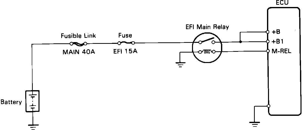 The SFI Main Relay receives battery current through the SFI fuse and is energized by a signal from the M-REL terminal of the ECM. The ECM receives relay input at terminals +B and +B1.