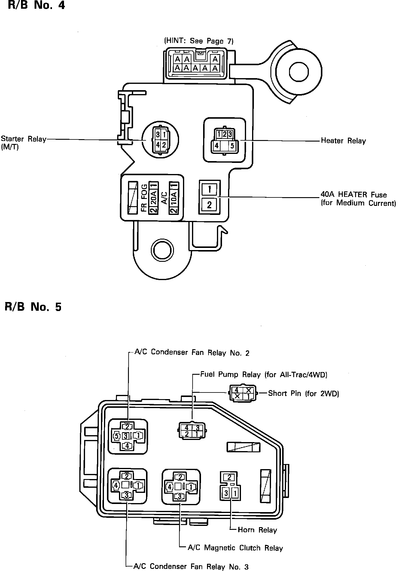 Fuse Panel: Relay Boxes No. 4 (Right Kick Panel) & No. 5 (Engine Compartment Front Right):