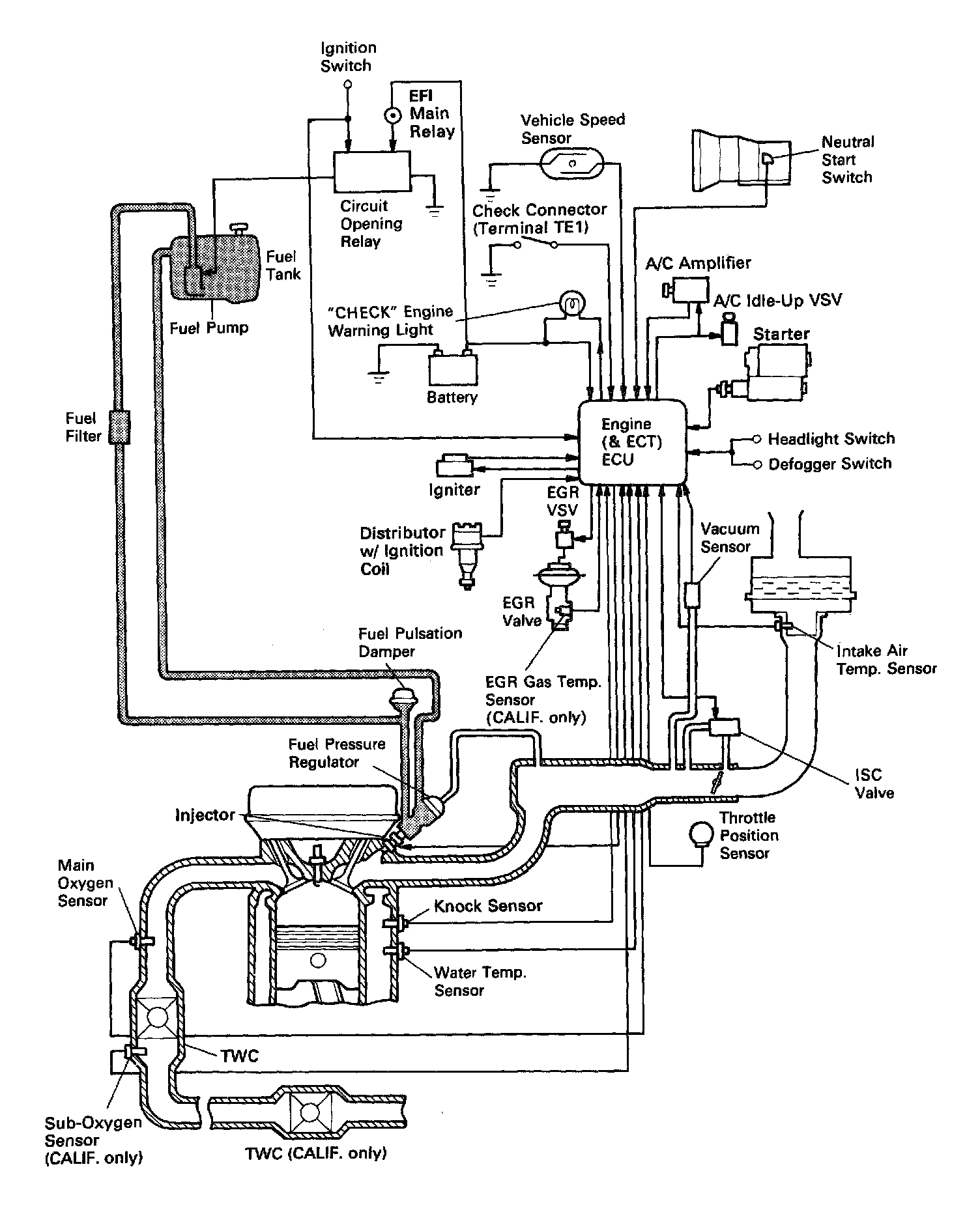 The Toyota Computer Control System (TCCS) is the central control for electronic fuel injection (EFI), electronic spark advance (ESA), idle speed control (ISC) and exhaust gas recirculation (EGR). The electronic control unit (ECU) monitors engine intake air volume, intake air temperature, coolant temperature, engine rpm and exhaust oxygen content, and regulates engine operation. The TCCS has a self-diagnostic function that helps find malfunctions or abnormalities in the system.