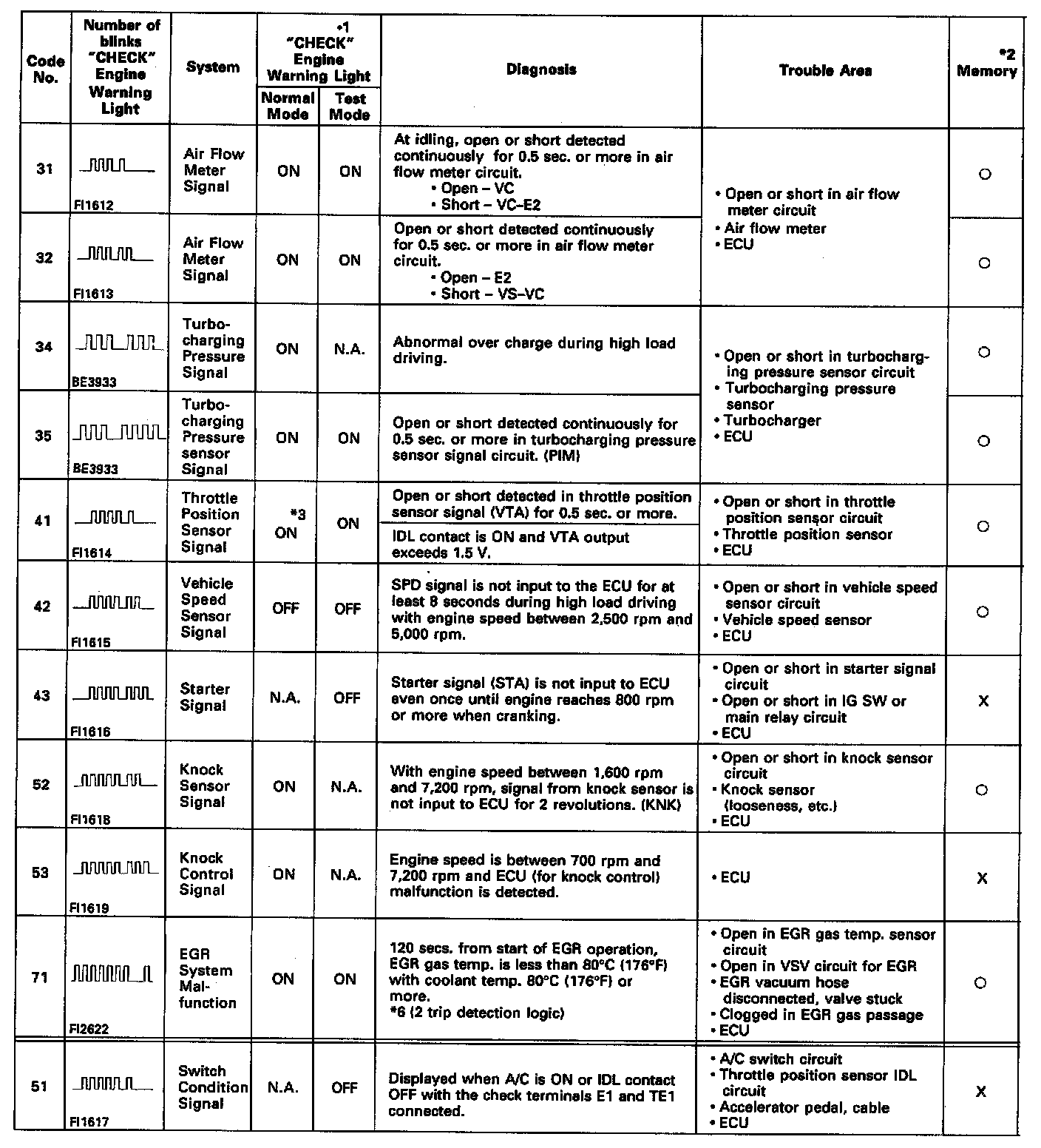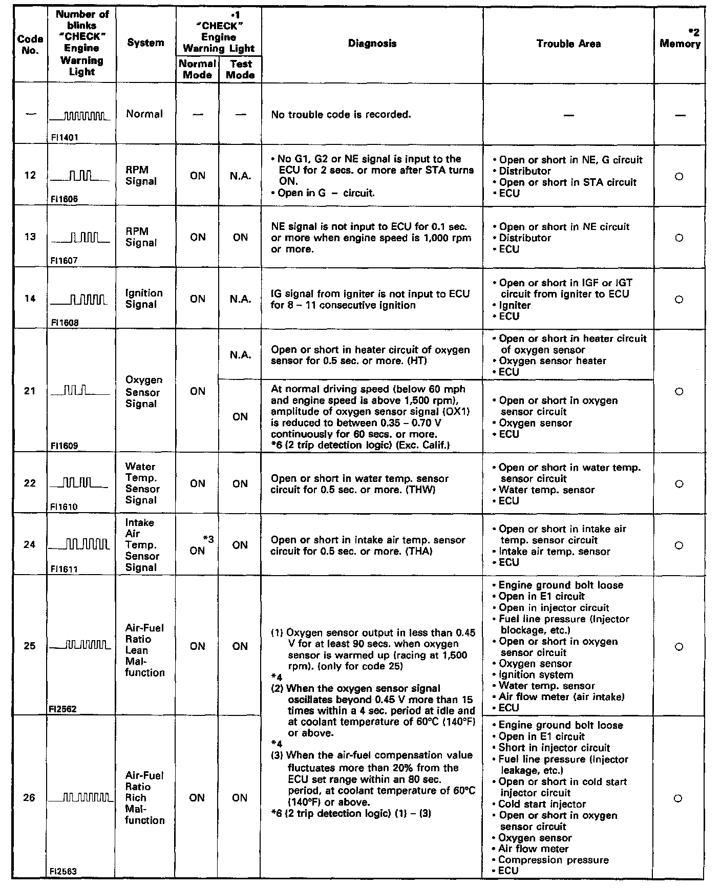 *1 "ON" displayed in the diagnosis mode column indicates that the "CHECK" Engine Warning Light is lighted up when a malfunction is detected.