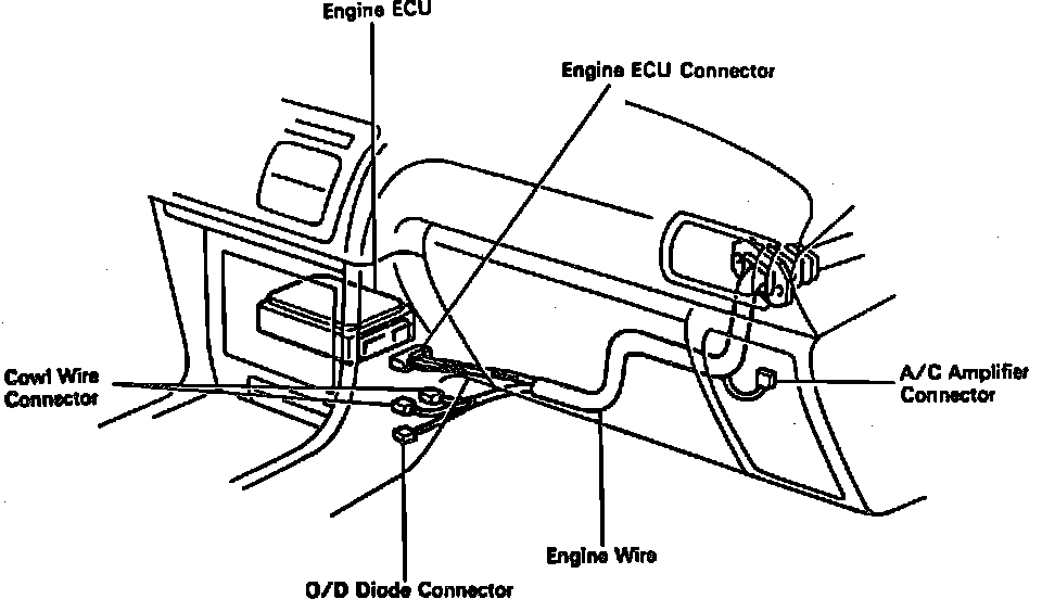 27. Remove engine wire clamp from wire bracket on right fender apron, then disconnect two cowl wire connectors.