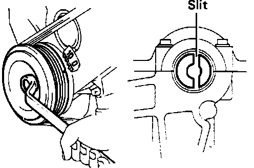 1. Rotate crankshaft to align timing mark on crank pulley with the TDC mark on the timing belt cover. Ensure position of the slit in the intake camshaft.