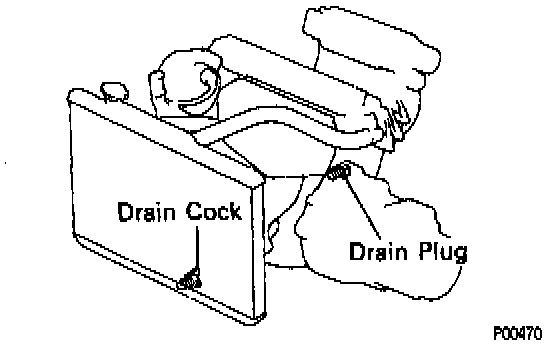 1. Drain the coolant from the radiator drain cock and engine drain plug. (Engine drain plug at the right rear of the engine block.)