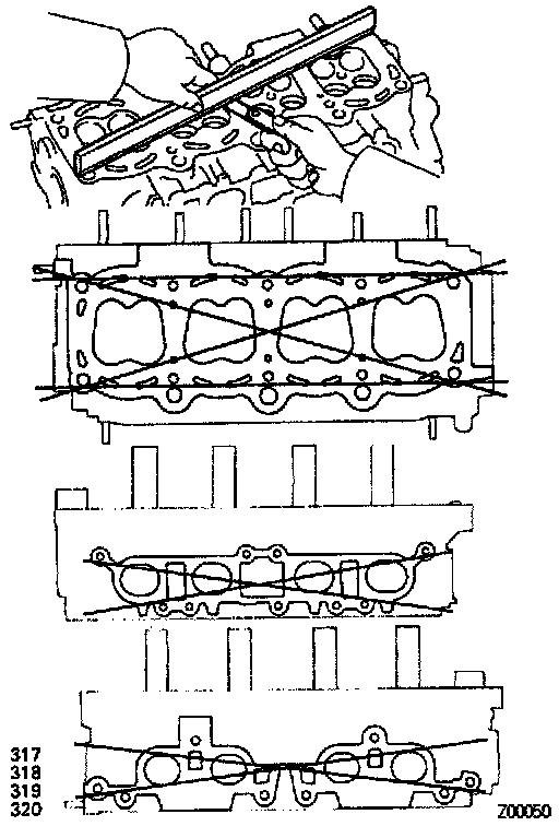 1. Inspect for flatness using precision straight edge and feeler gauge, measure the surfaces contacting the cylinder block and the manifolds for warpage.