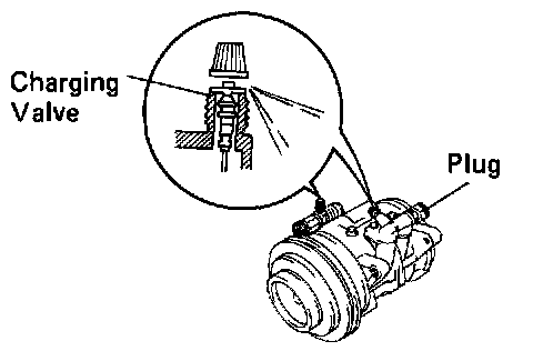 5. Discharge gas in new compressor from charging valve before installing it. If the gas in new compressor is not discharged first, compressor oil will spray out with gas when the plug is removed.