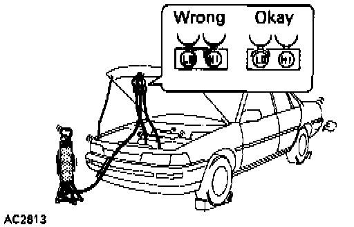 2. Do not open high pressure valve of manifold gauge with compressor operating. If the high pressure valve is opened, refrigerant flows in the reverse direction and could cause the charging cylinder to rupture, so open and close the low pressure valve only.
