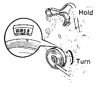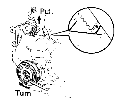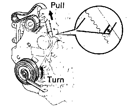 ^ Align the matchmark by pulling the timing belt up on the water pump pulley side while turning the crankshaft pulley counterclockwise.