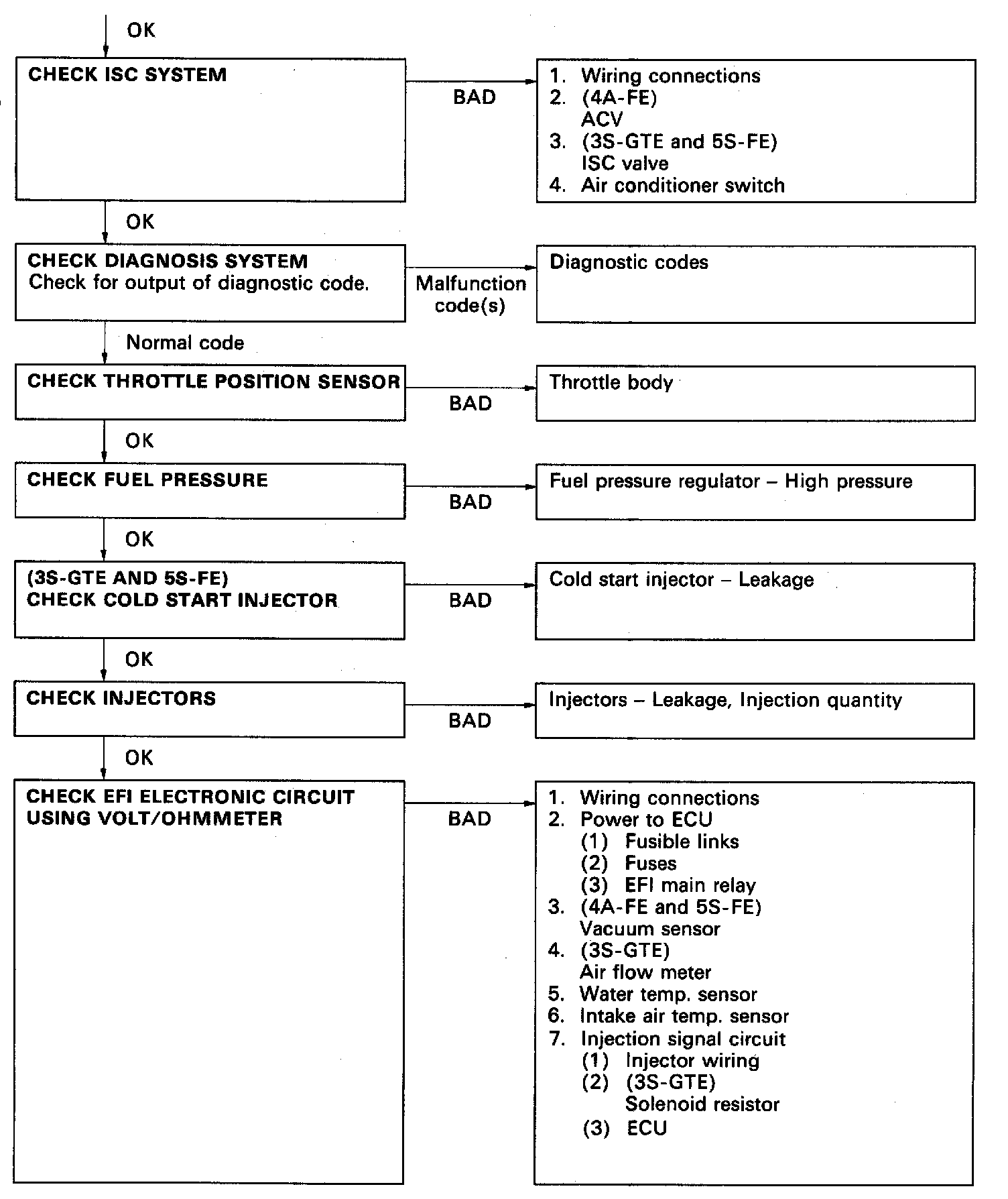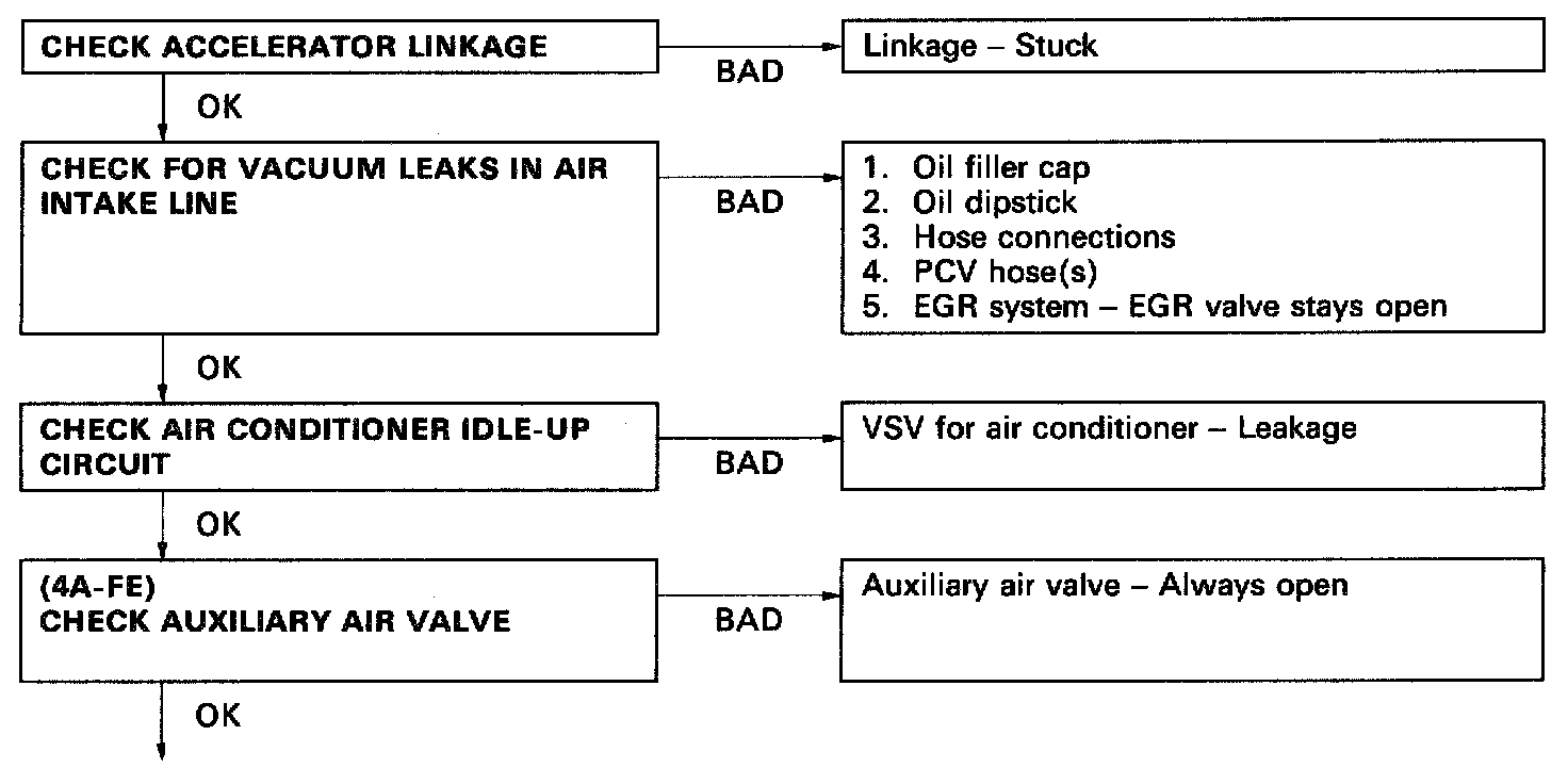 HINT: Disconnecting the battery will cause the idling speed data in the ISC to be returned to the initial idling speed, causing the idling speed to rise above 700 rpm (5S-FE USA), 750 rpm (5S-FE CANADA). Should this happen, either carry out a driving test, including stop-go several times at a speed above 10 km/h, or start the engine, idle for 30 seconds and then turn the engine off repeatedly. by doing this, idle data will be stored in the ISC and the idle rpm will be at specified value.