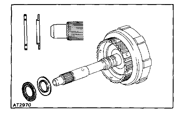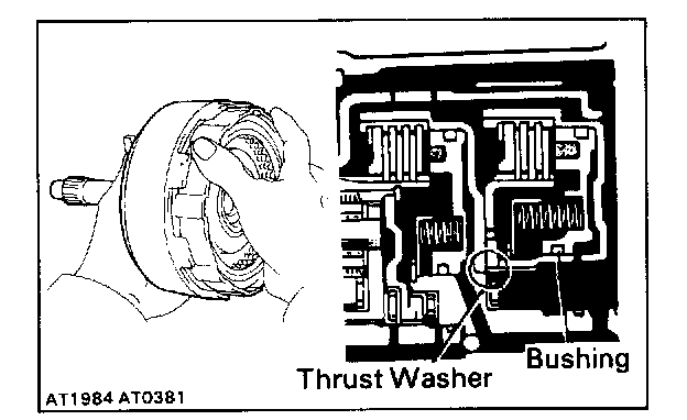 HINT: If the flukes of the discs are meshed with the hub correctly, the end of the bushing with the direct clutch drum will be flush with the surfaces of the forward clutch.