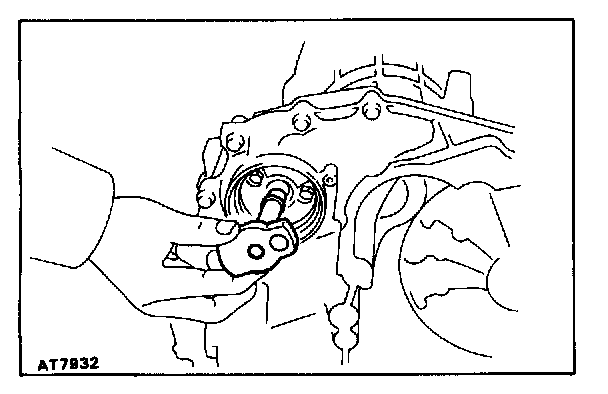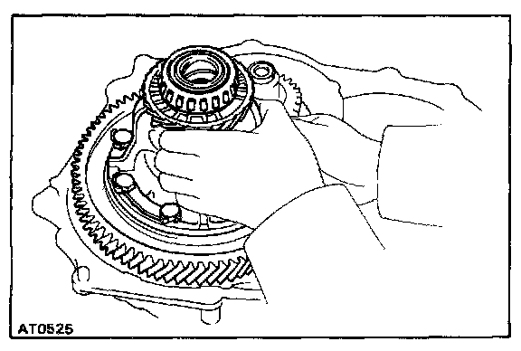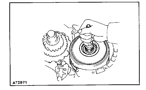 d. Hold the input shaft, and lightly press the oil pump body to slide the oil seal rings on the stator shaft through the direct clutch drum.