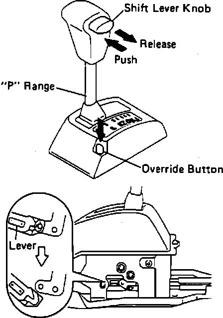 6. While pushing shift lock override button, push shift lever knob, then release it. Ensure set cable lever is released.