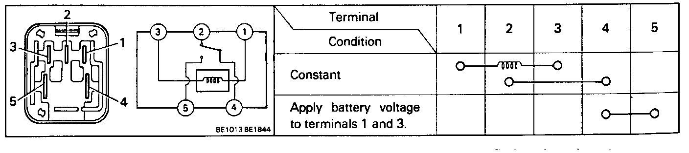 Apply power to terminals 1 and 3. Continuity should exist between terminals 4 and 5. If not as specified, replace the relay.