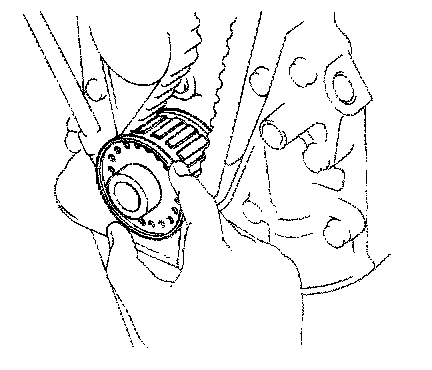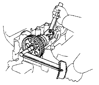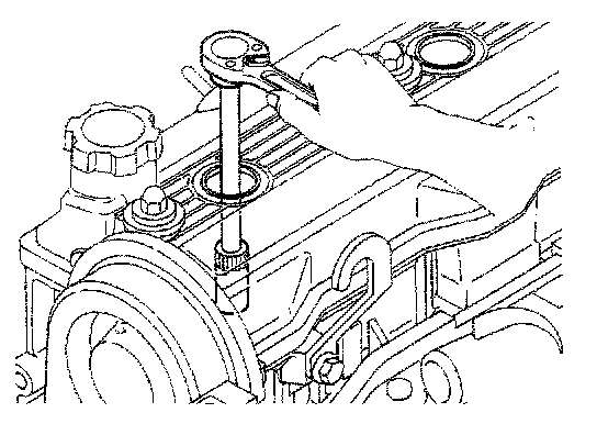 (c) Hold the hexagonal wrench head portion of the camshaft with a wrench, and tighten the timing pulley bolt.