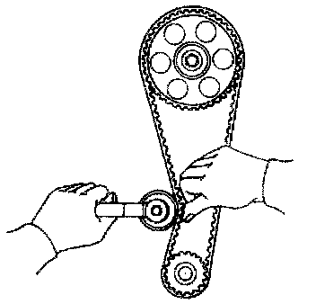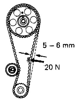 Timing belt deflection: 5 - 6 mm (0.20-0.24 in.) at 20 N (2 kgf, 4.4 lbf)