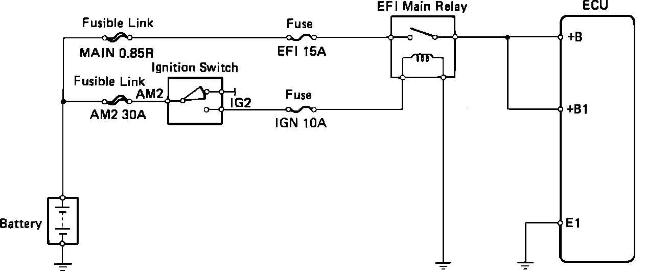 The EFI Main Relay is supplied battery current through the EFI fuse and is energized by a signal from the ignition switch. The ECU receives relay input at terminals +B and +B1.