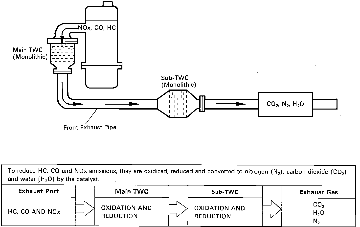 The three way catalyst (TWC) reduces oxides of nitrogen (NOx) as well as HC and CO, producing nitrogen, water, and carbon dioxide as by-products.