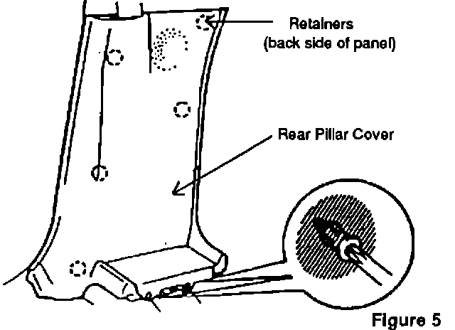 a) Push in the center pins of the two retainers securing the bottom edge of the passenger side rear pillar cover, then pry them out as shown in Figure 5.