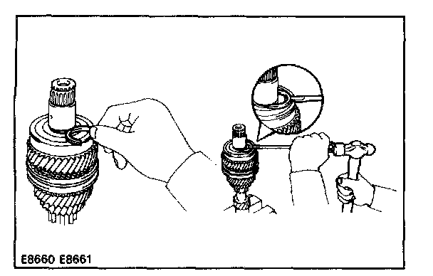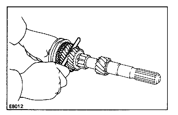 5. INSTALL SPACER, SYNCHRONIZER RING, NEEDLE ROLLER BEARINGS, FOURTH GEAR AND RADIAL BALL BEARING