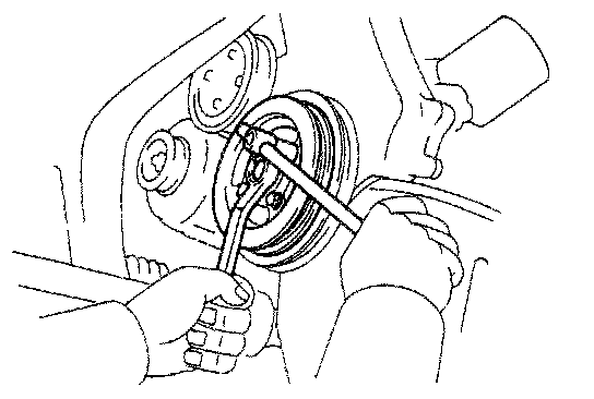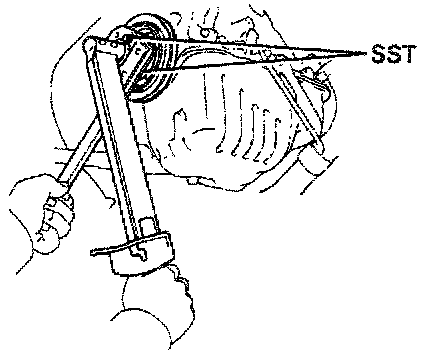 (b) Using SST to hold the pulley. torque the nut.