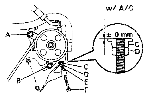 (e) Turn the adjusting bolt F to push up the pump and adjust the belt tension to the specified value.