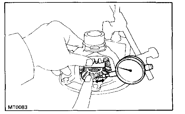 Using a dial indicator, measure the side gear backlash while holding one pinion gear toward the case.