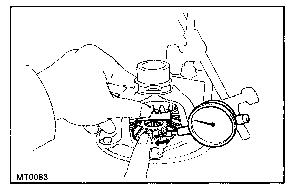 Using a dial indicator, measure the backlash of one side gear while holding one pinion toward the case.