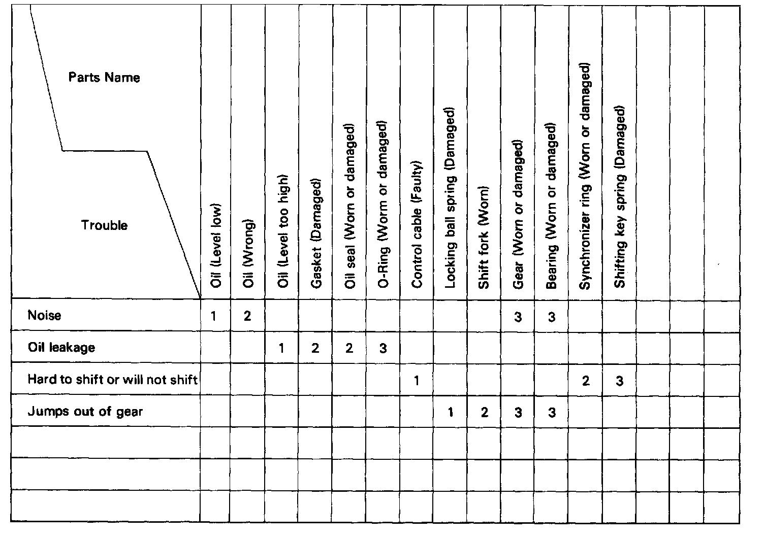 You will find the troubles easier using the image shown. In this image, each number shows the priority of causes in troubles. Check each part in order. If necessary, replace these parts.