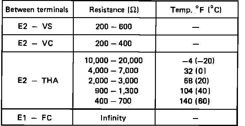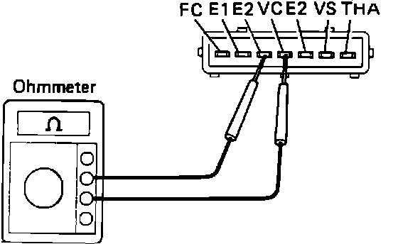 1. Disconnect Air Flow Meter connector.2. Using an Ohmmeter, measure the resistance between each terminal. (Refer to chart)