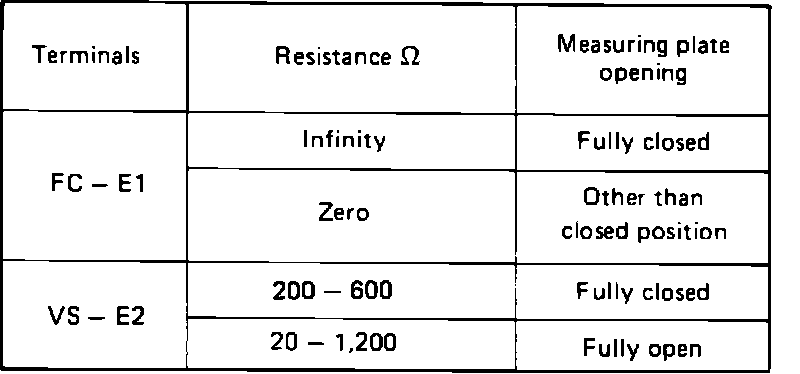 1. Disconnect Air Flow Meter connector.2. Using an Ohmmeter, measure the resistance between each terminal. (Refer to chart)