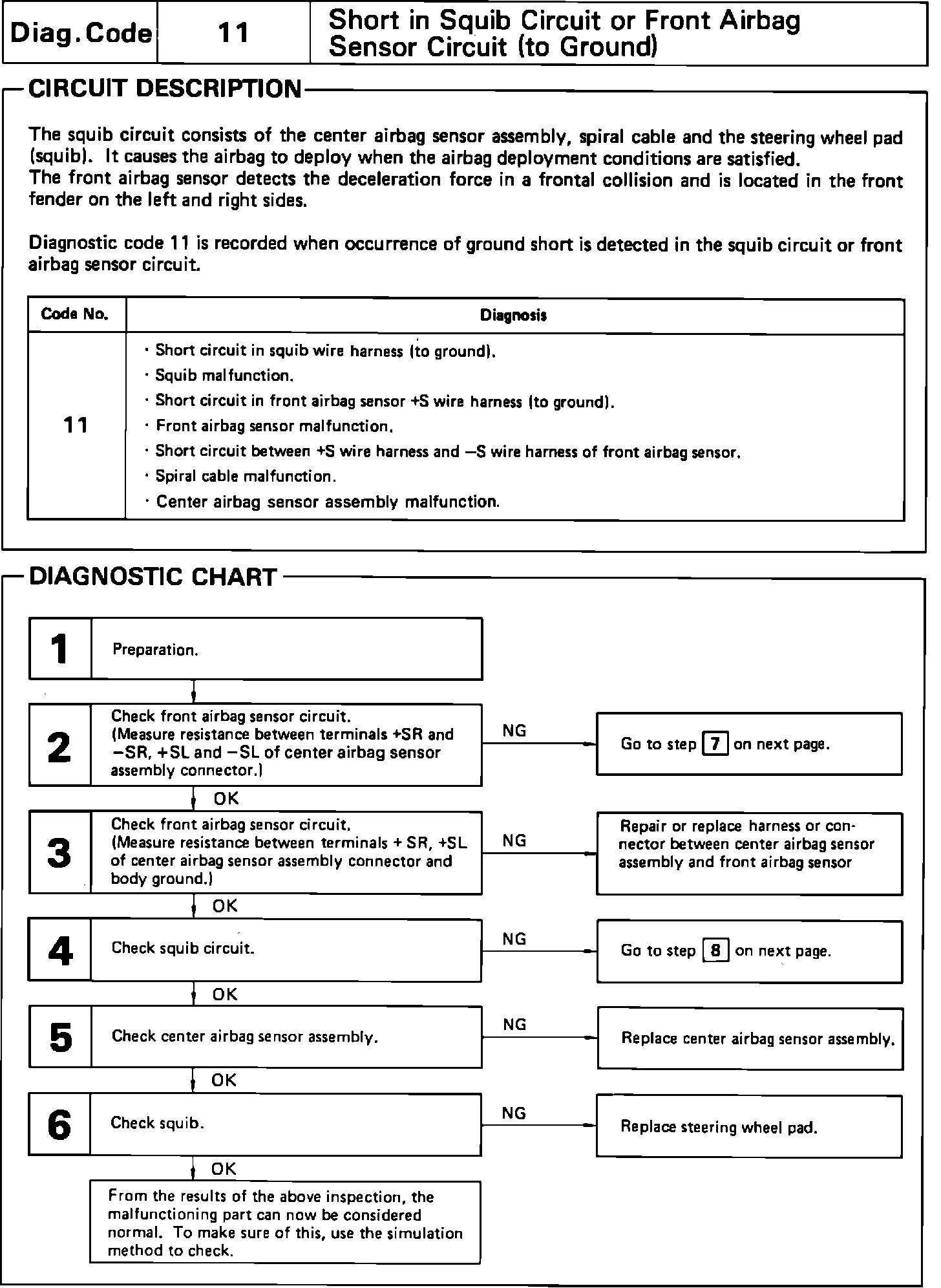Fig. 27 Diagnostic Code 11 (Short In Squib Circuit Or Front Airbag Sensor Circuit, Part 1 Of 6). Celica, MR2 & Supra: